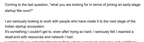 I had good enough skills to work on mobile apps and front-end. I saw an opening on Twitter (a tweet from Preetam) and reached out to him. When he asked, "what am i look for?" This is what I answered for it.